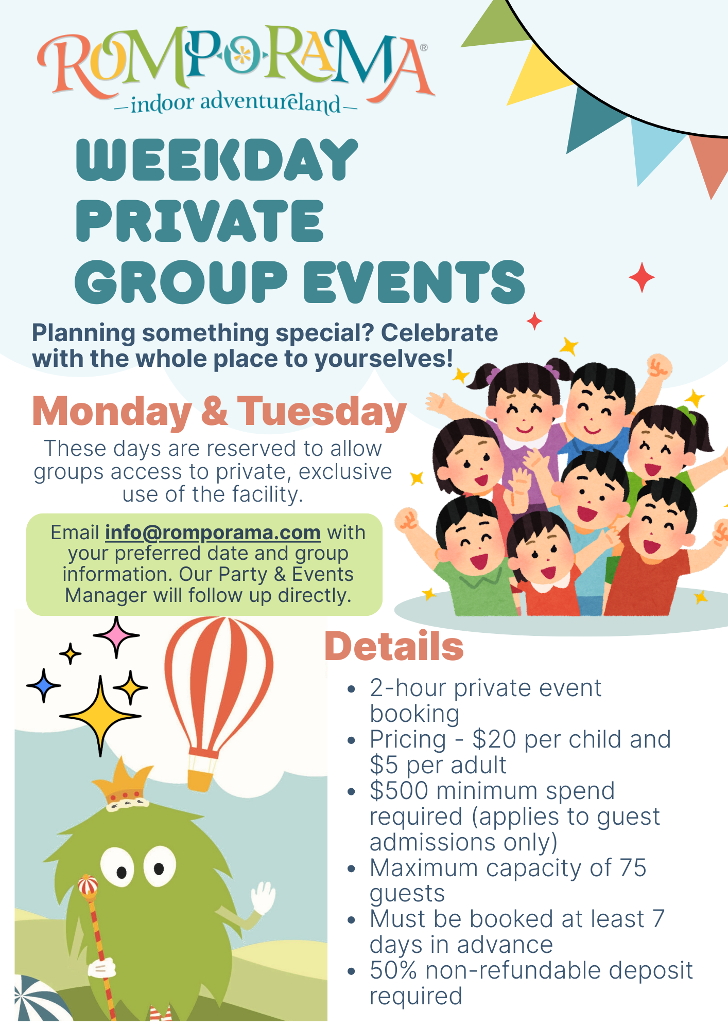 Parties are now available for booking 7 days a week! Private Parties/Events (Monday & Tuesday), Weekday 2-Hour Party bookings (Wednesday &Thursday) are available at a discounted rate, and there are three package options for Weekend Party bookings (Friday - Sunday) to best suit your needs.